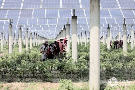 協(xié)鑫新能源副總裁張耀邦介紹,該基地聯(lián)合江蘇省農(nóng)科院、南京農(nóng)業(yè)大學等科研院所,為該基地設計出一款高支架,使光伏板距地面高達2.8米。將常規(guī)5米立柱桁架跨度加寬到7米。同時,因地制宜地研發(fā)出96片、單塊415瓦的超大組件,增加農(nóng)作物的光照面積,并采用自主研發(fā)的平單軸跟蹤技術,對陽光進行智能跟蹤,確保陽光最大化直射光伏板和農(nóng)作物。